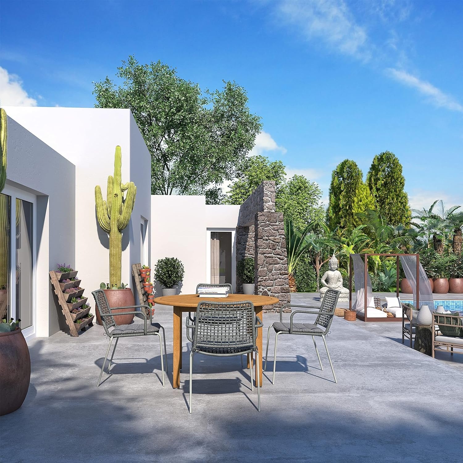 - 5-PIECE SET | This rectangular set includes 4 chairs made of steel with a matte finish with a rope seat and back, and 1 teak finish round table. This set will make your outdoors an elegant space to enjoy with family and friends. Grey Cushions Included.