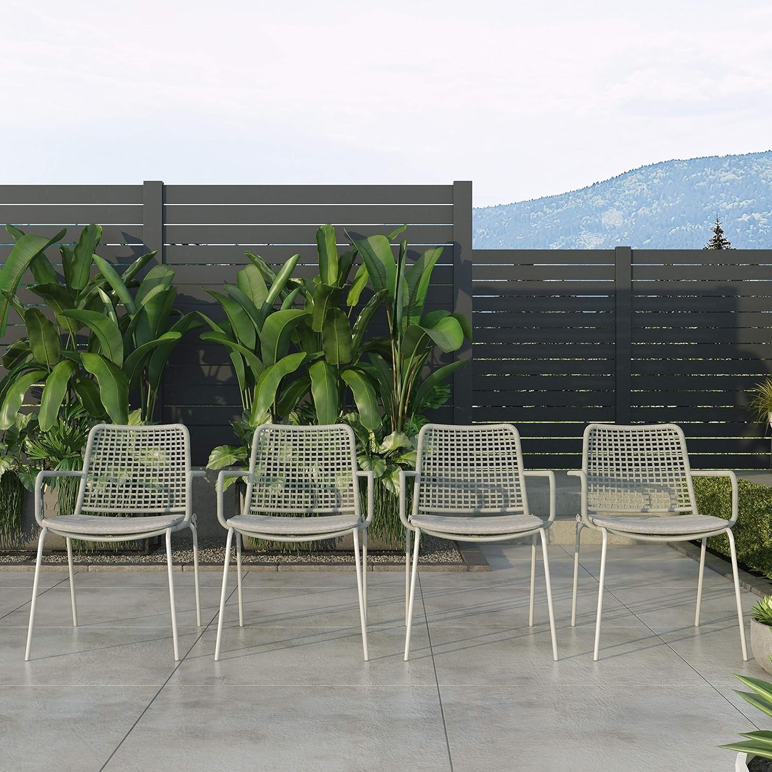 - CHAIRS | These outdoor dining chairs were designed under a modern influence. They are durable, lightweight but also sturdy. Outdoor patio chairs' frame is made of high-quality steel with a matte finish with a rope seat and back. The combination of these outdoor dining chairs is able to give you the best performance under outdoor conditions.